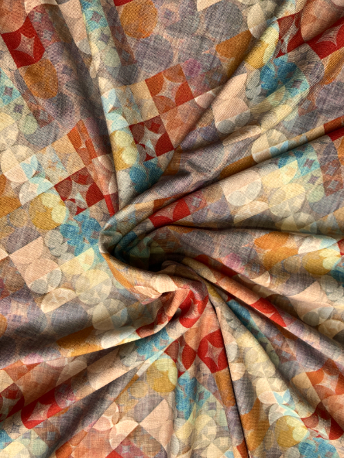Camel Beige, Red, Orange and Turquoise geometric square / circle digitally printed 95% Viscose 5% Elastane lightweight drapey Jersey, 50% stretch