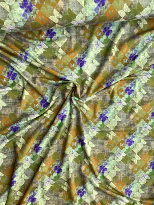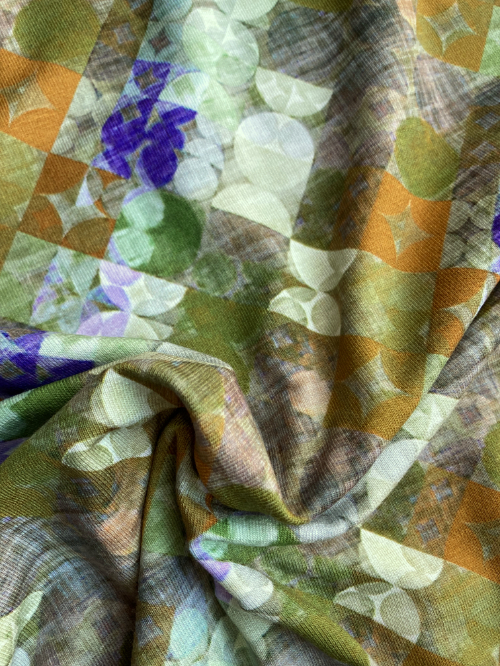 Moss Green, Chartreuse, Violet and Ochre geometric square / circle digitally printed 95% Viscose 5% Elastane lightweight drapey Jersey, 50% stretch