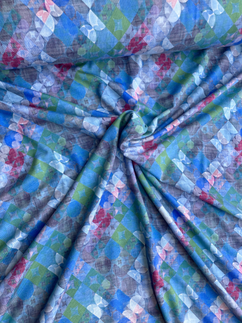 Sky Blue, Cornflower, Emerald & Crimson geometric square / circle digitally printed 95% Viscose 5% Elastane lightweight drapey Jersey, 50% stretch