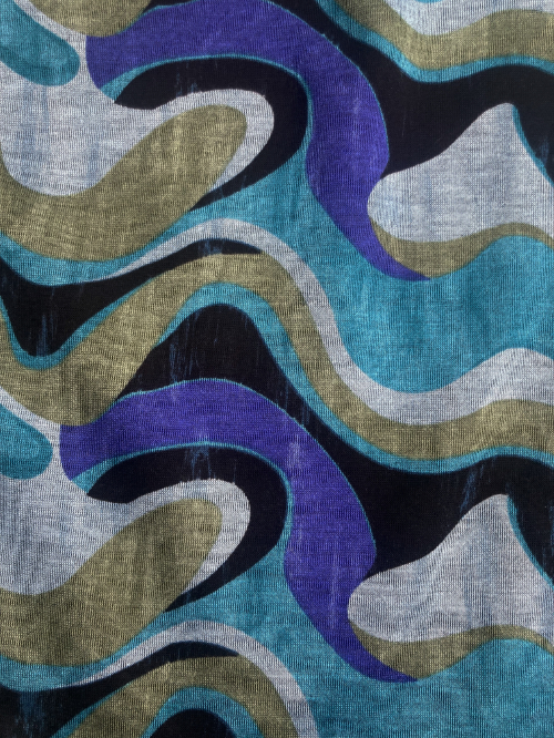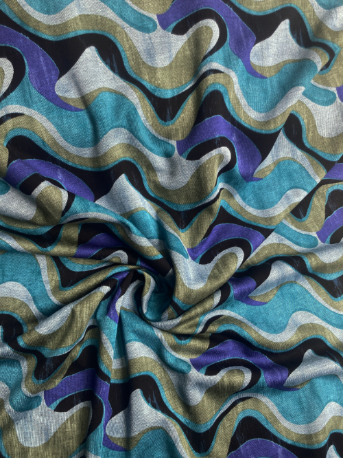 Teal Blue, Royal, Forest Green and Black Pucci style swirl print 55% Polyester 45% Viscose Ponte Roma double Jersey, 40% stretch