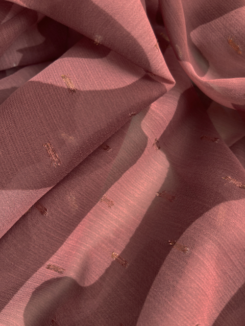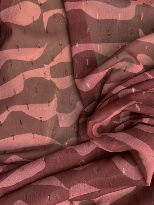 Terracotta and Pink geometric print with Copper flecked spots 99% Polyester 1% Lurex Chiffon