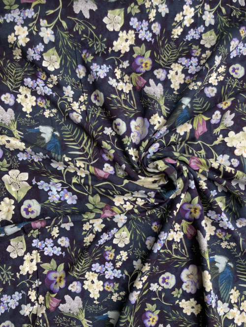 Navy Blue, Purple and Green night garden floral print 95% Viscose 5% Elastane drapey lightweight Jersey
