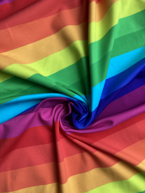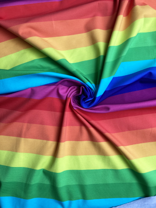 Multicolour bright rainbow 30mm horizontal stripe 95% Cotton 5% Elastane T-shirt weight Jersey, 39cm repeat, 30% Stretch